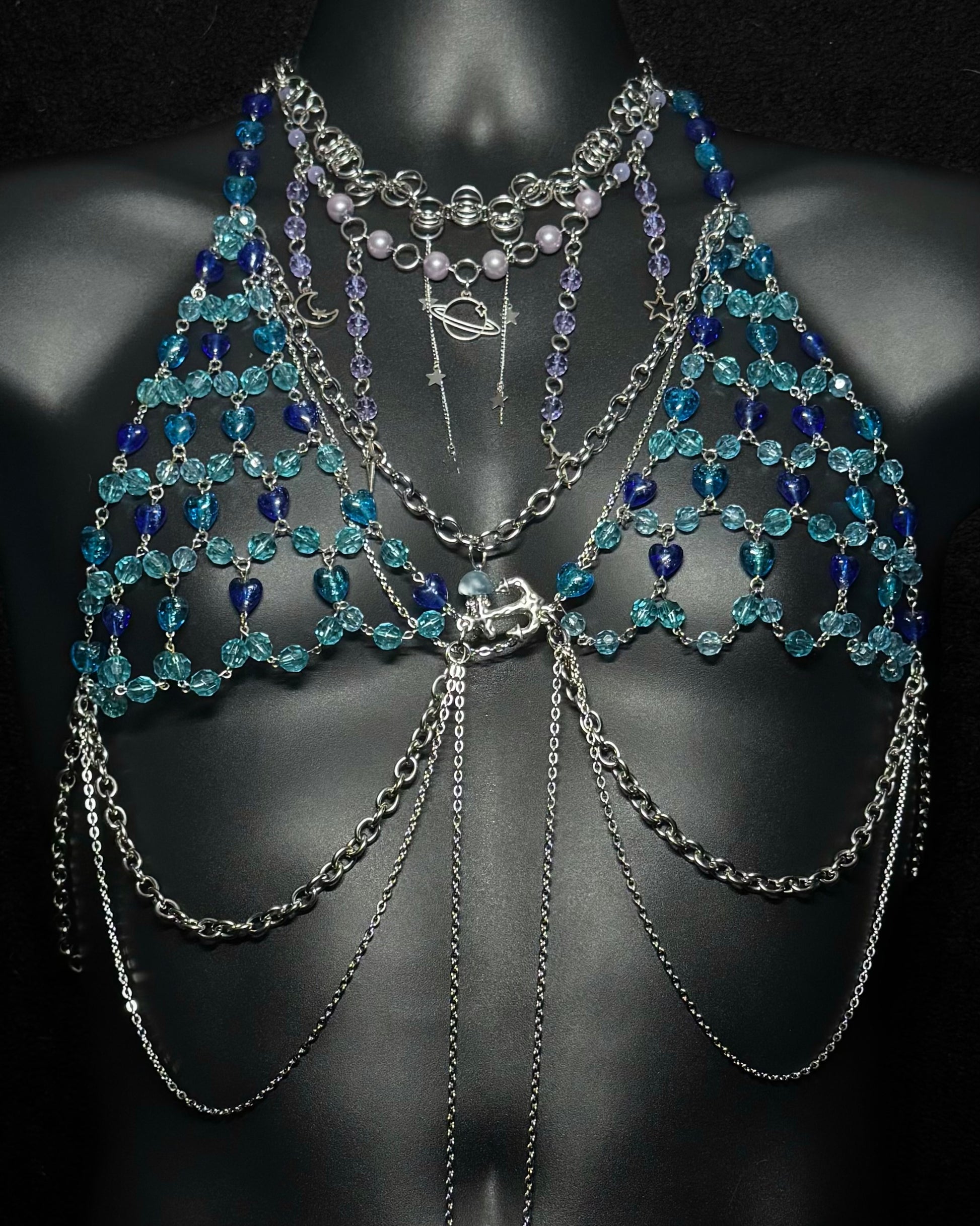 Shimmering blue beads form a bold bra silhouette, creating an icy, oceanic effect that commands attention. At its core, a stainless-steel anchor charm drapes at the sternum—symbolizing strength, depth, and desire. Chains interlace with the beadwork, grounding the piece in the brand’s signature industrial edge.