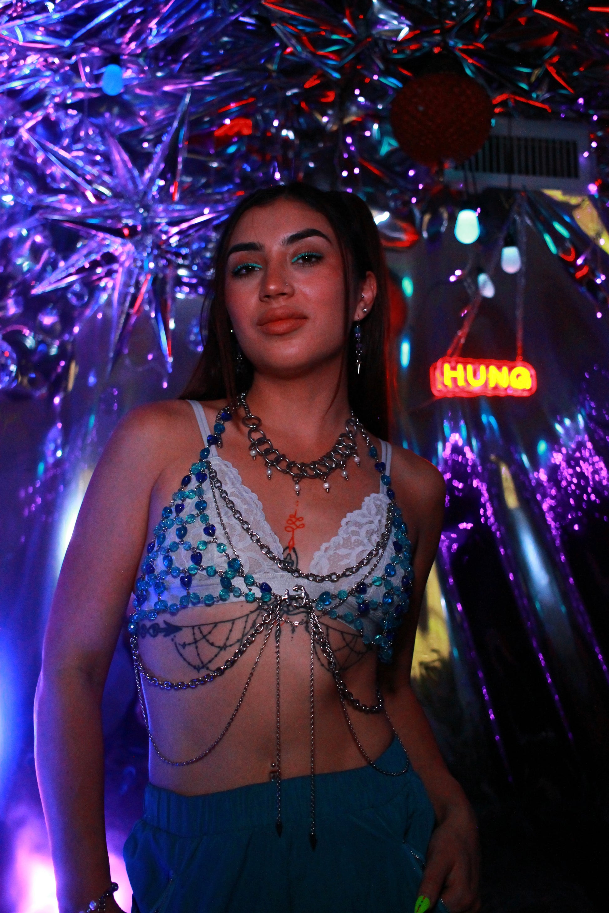 Make waves in Blue Crush, a one-of-a-kind beaded bra that fuses playful Y2K energy with raw, industrial sensuality. Handcrafted from electric blue beads and finished with a silver anchor charm at the center of the chest, this piece is equal parts aquatic fantasy and rebellious statement.