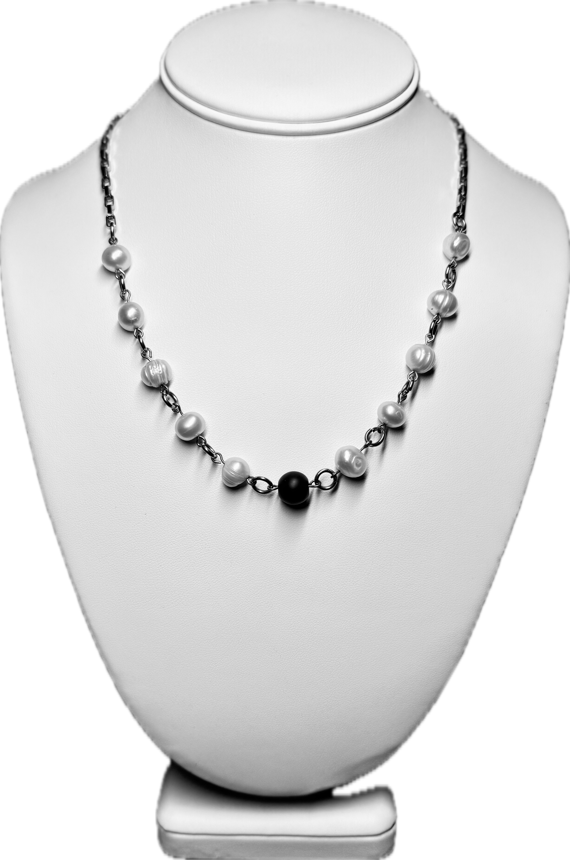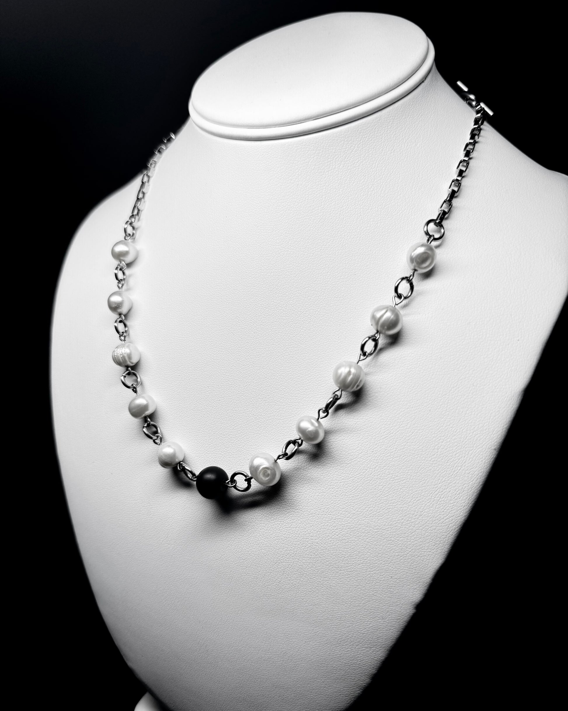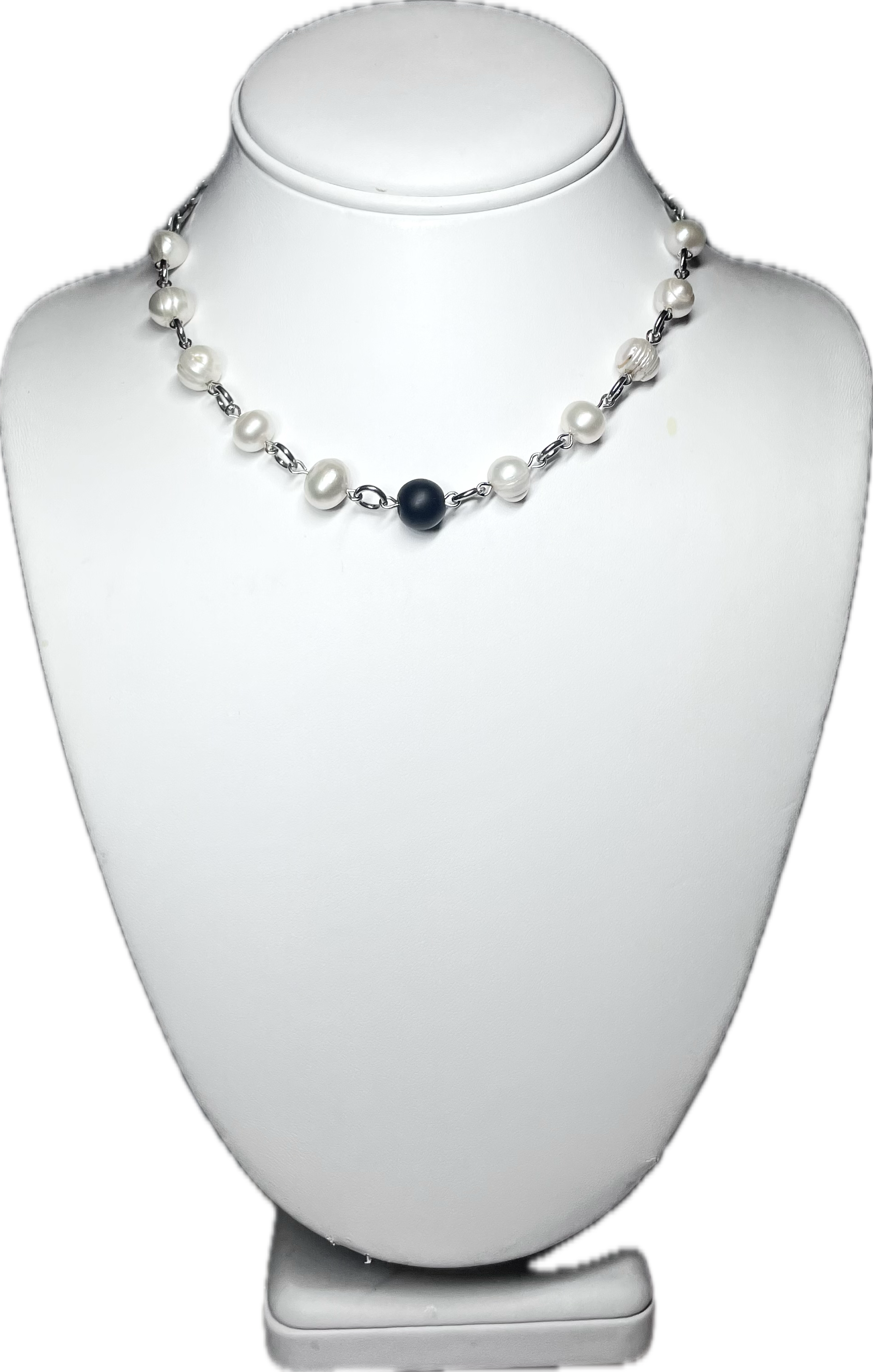 Β Dazzling white Freshwater Grade A Pearls and a black pearl so deep blue it appears black nestled perfectly in a shining stainless steel necklace. Experience a dreamy, cinematic look-the perfect way to elevate your Washed Up beach look. This one-of-a-kind jewelry piece is crafted with a timeless combination of genuine, high-grade pearls and stainless steel to create a look that's both strong and delicate. Get Washed Up and add a touch of elegance to your beach wardrobe.Β
